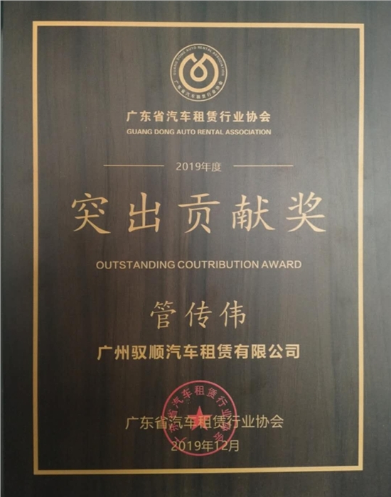 广东省汽车租赁行业协会2019年度突出贡献奖